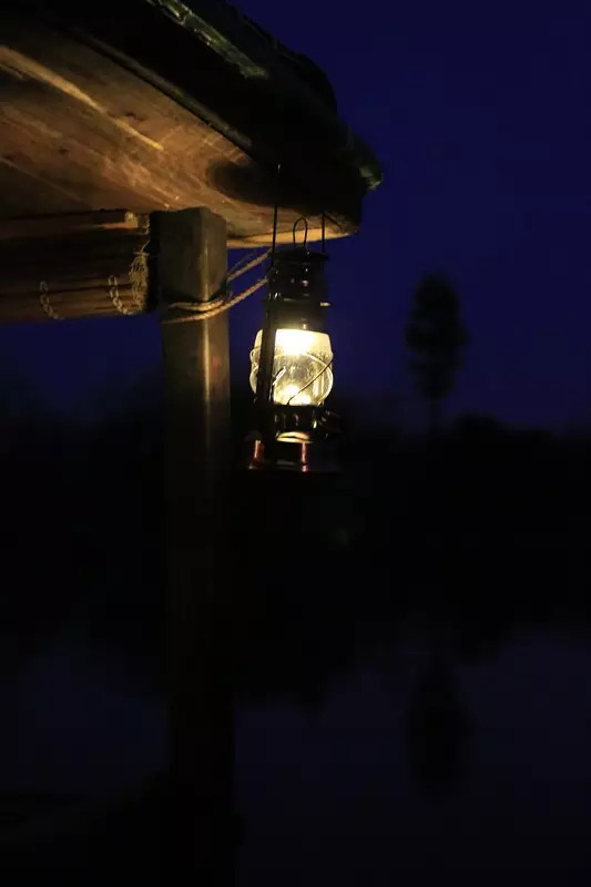 太阳慢慢落下地平线……老船灯和蜡烛在水中的光影,在暮色下随着摇橹船流动着,别有一番风情。