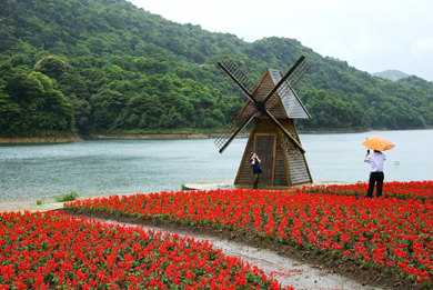 大红色的一串红、金黄色的硫化菊、紫色的千日红、橙色的百日草、深红色的红穗冠、淡黄色的黄穗冠和粉色的朱唇汇聚成一道亮丽的彩虹,降落在蓝天碧水之间,为您创造了一个七彩斑斓的童话世界。