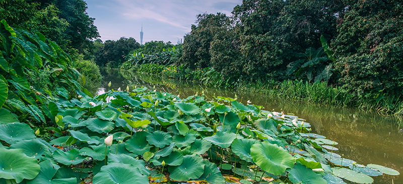 【城央绿核】广州新中轴在湿地穿越而过,琶洲国际会展与湿地内千年商埠黄埔古港交相辉映,新地标小蛮腰在湖面倒影摇曳,CBD霓虹在林间闪烁光华——海珠湿地是国内罕见的城央湿地,绿意盎然的果林成为了市民家门口的休闲区。